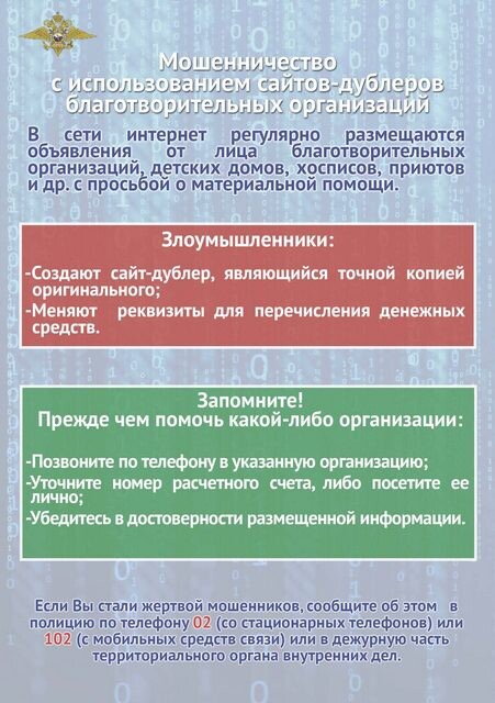 Столкнувшись с подозрительными фактами или лицами, оперативно информируйте представителей МВД по телефону - 02, с сотового – «102», «112».